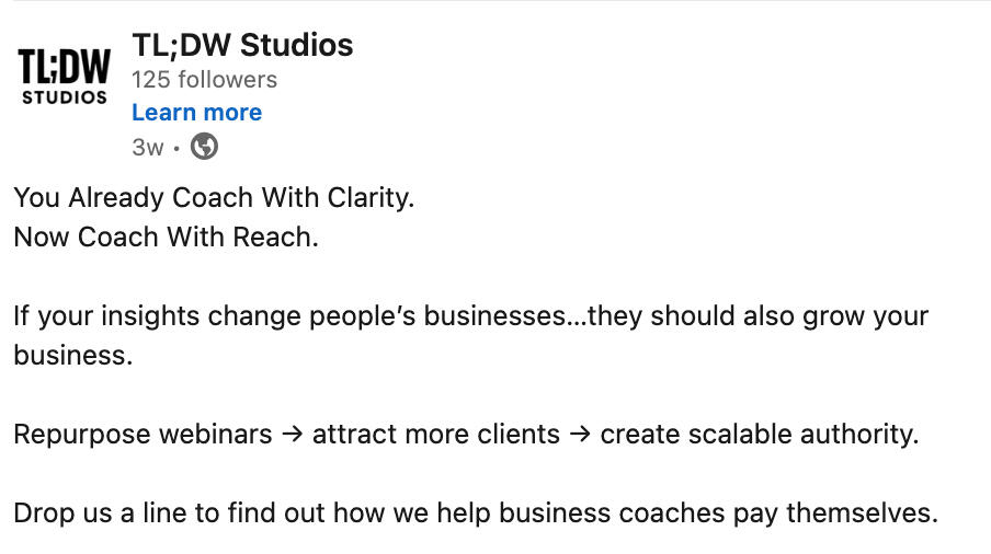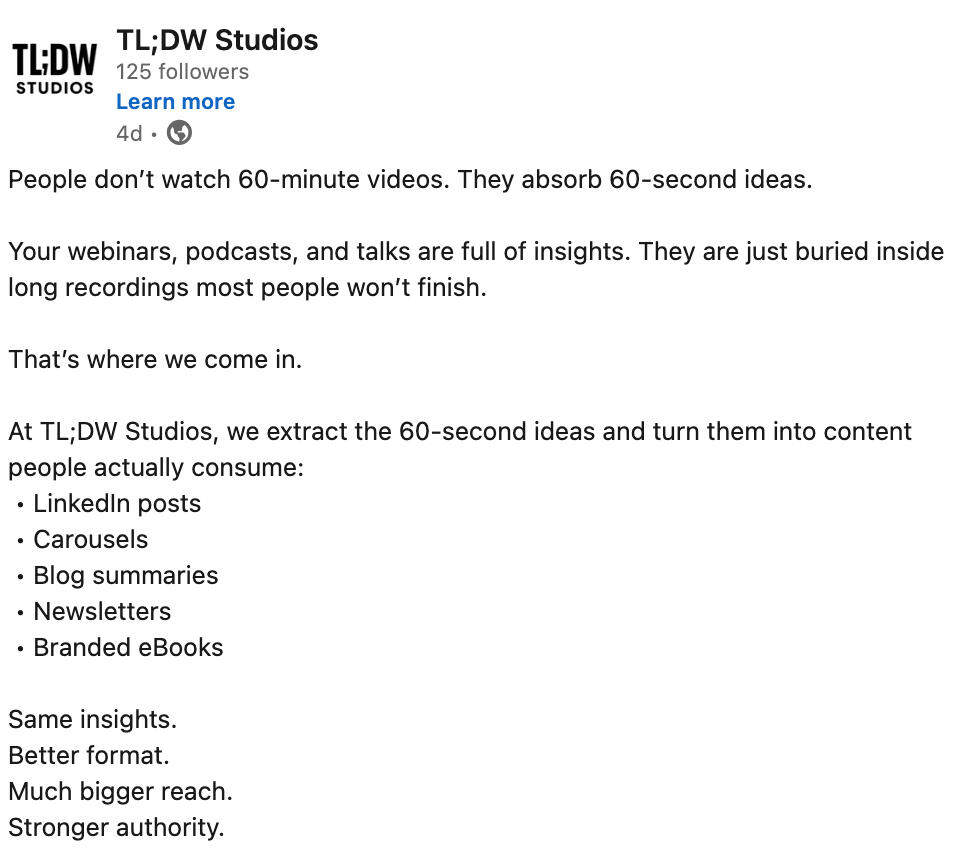 "Our webinar series had great content but no staying power. TL;DW turned them into professional Linkedin posts that drive constant engagement for our senior execs."